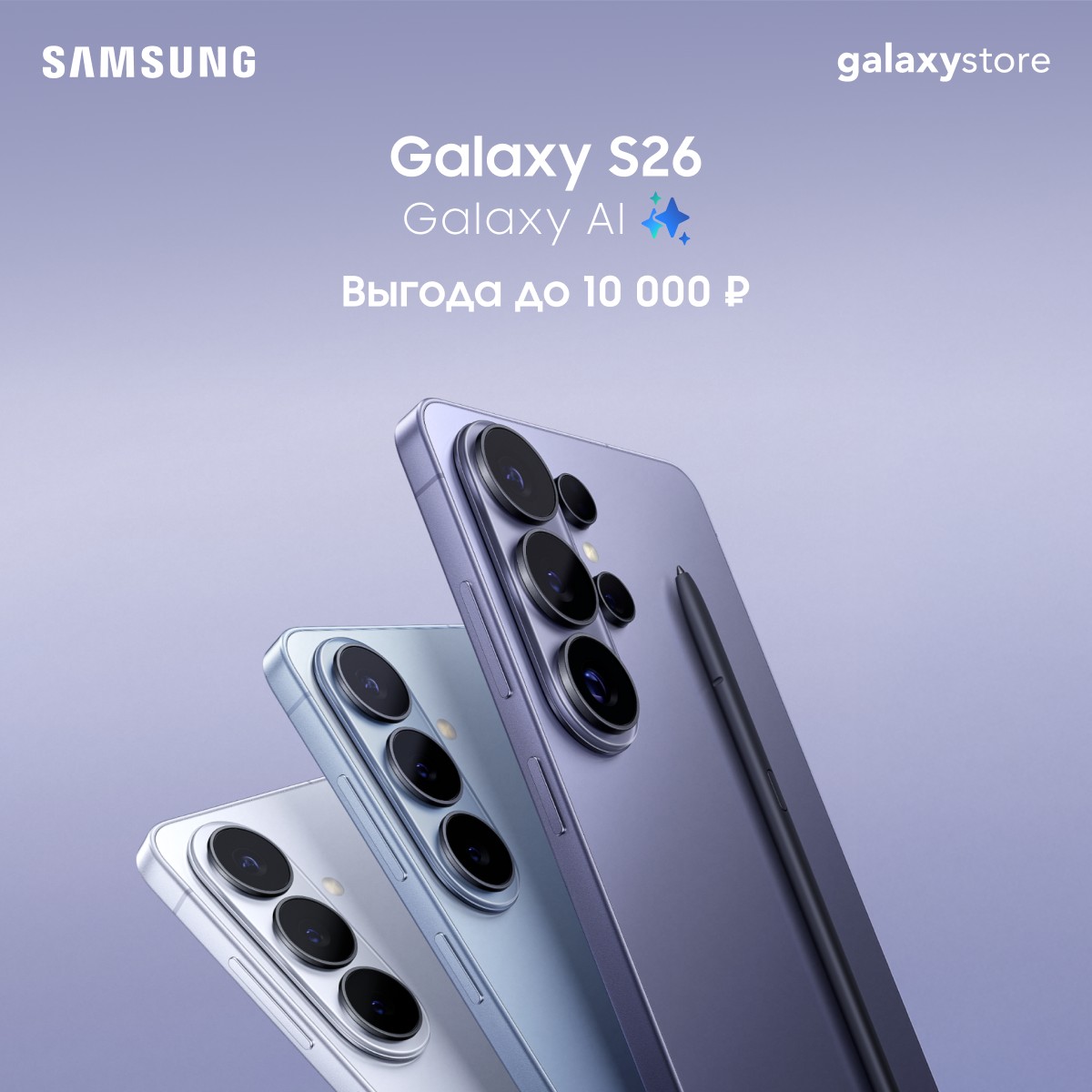 До 30 апреля 2026 года приобретая смартфон Galaxy S26 Ultra в фирменном магазине Samsung, вы получаете выгоду до 10 000 рублей.