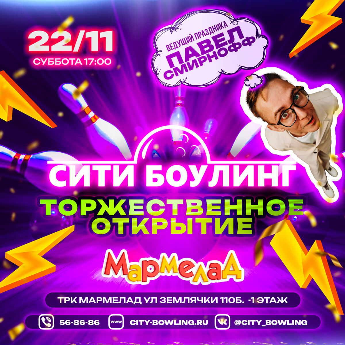 22 ноября в 17:00 состоится торжественное открытие нового зала «СИТИ БОУЛИНГ» в ТРК «Мармелад» (ул. Землячки, 110Б, −1 этаж).